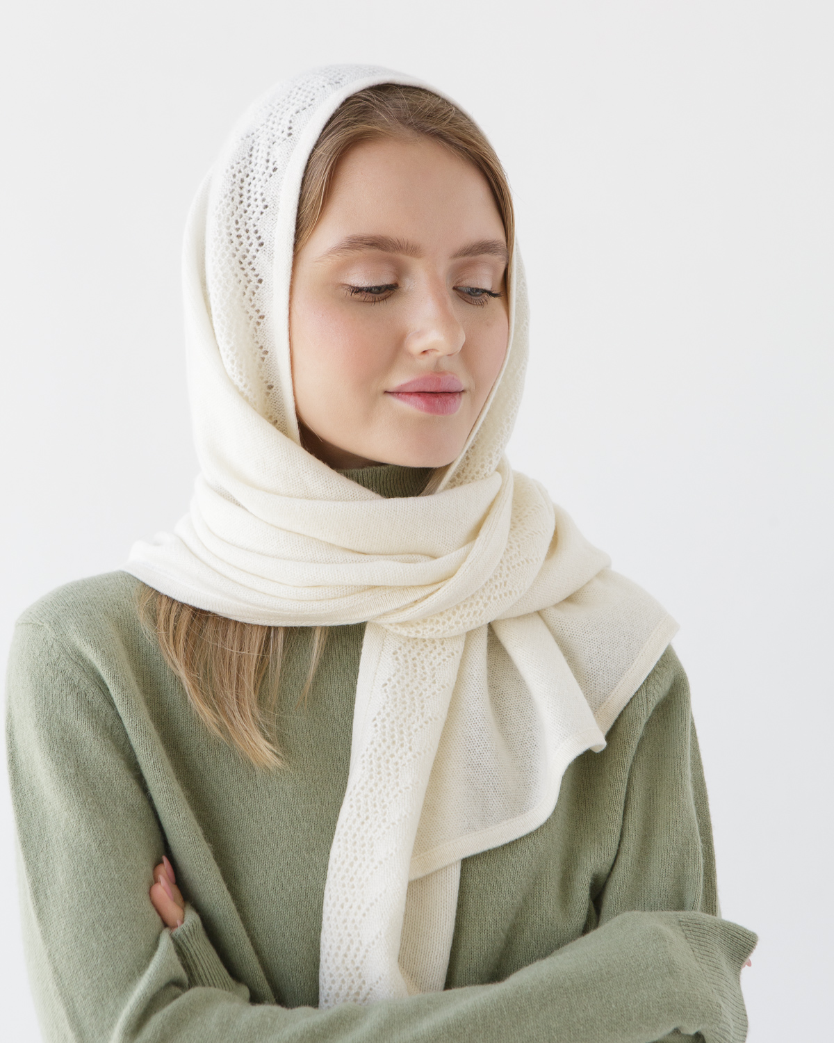 Косынка красиво драпируется, позволяя носить её различными способами: как платок на голову, как шарф или накидку на плечи. Лаконичный дизайн подчёркивает натуральную текстуру кашемира и универсальность модели.