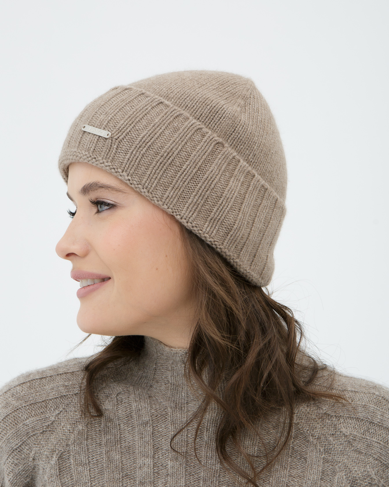 Классическая форма с аккуратной вязкой и подворотом создаёт универсальный, вневременной образ. Минималистичная металлическая плашка добавляет изделию аккуратный акцент и подчёркивает премиальность.