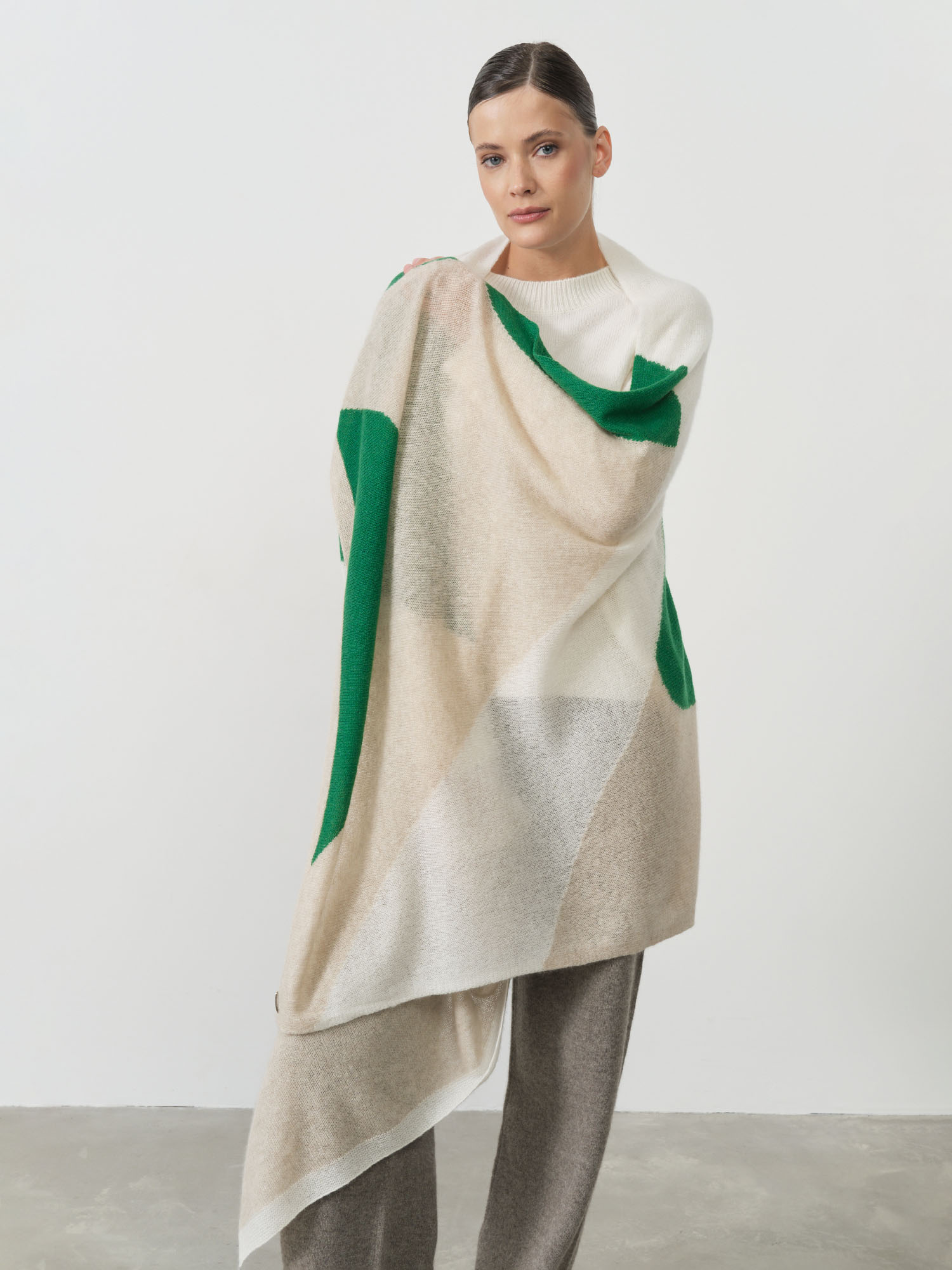 Свободная форма и крупные цветовые элементы создают выразительный графичный дизайн. Лёгкая и пластичная структура кашемира позволяет изделию красиво струиться и формировать мягкие складки.