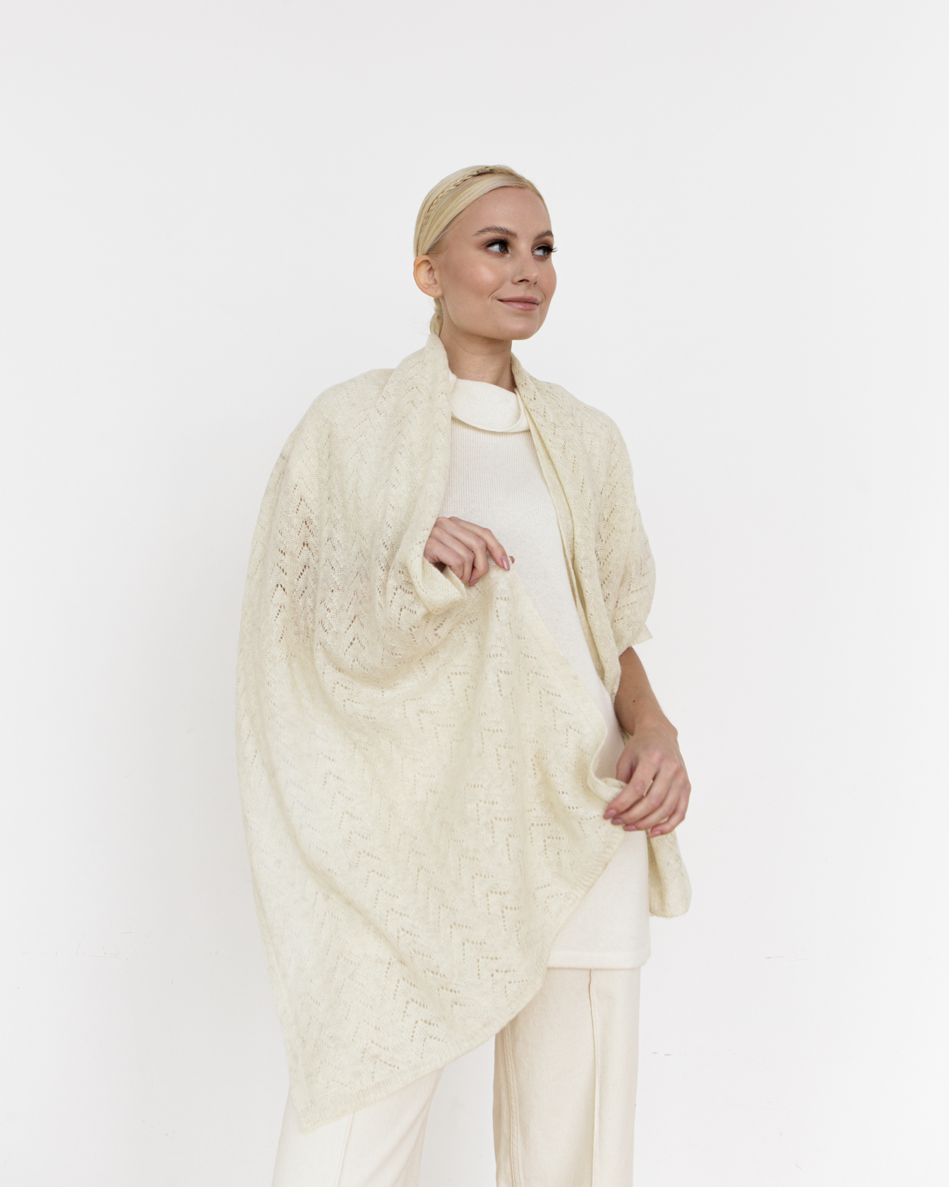 Модель выполнена в классической прямоугольной форме с декоративной ажурной вязкой и фактурным узором. Легкая структура ткани придает изделию воздушность и делает его элегантным элементом образа.
