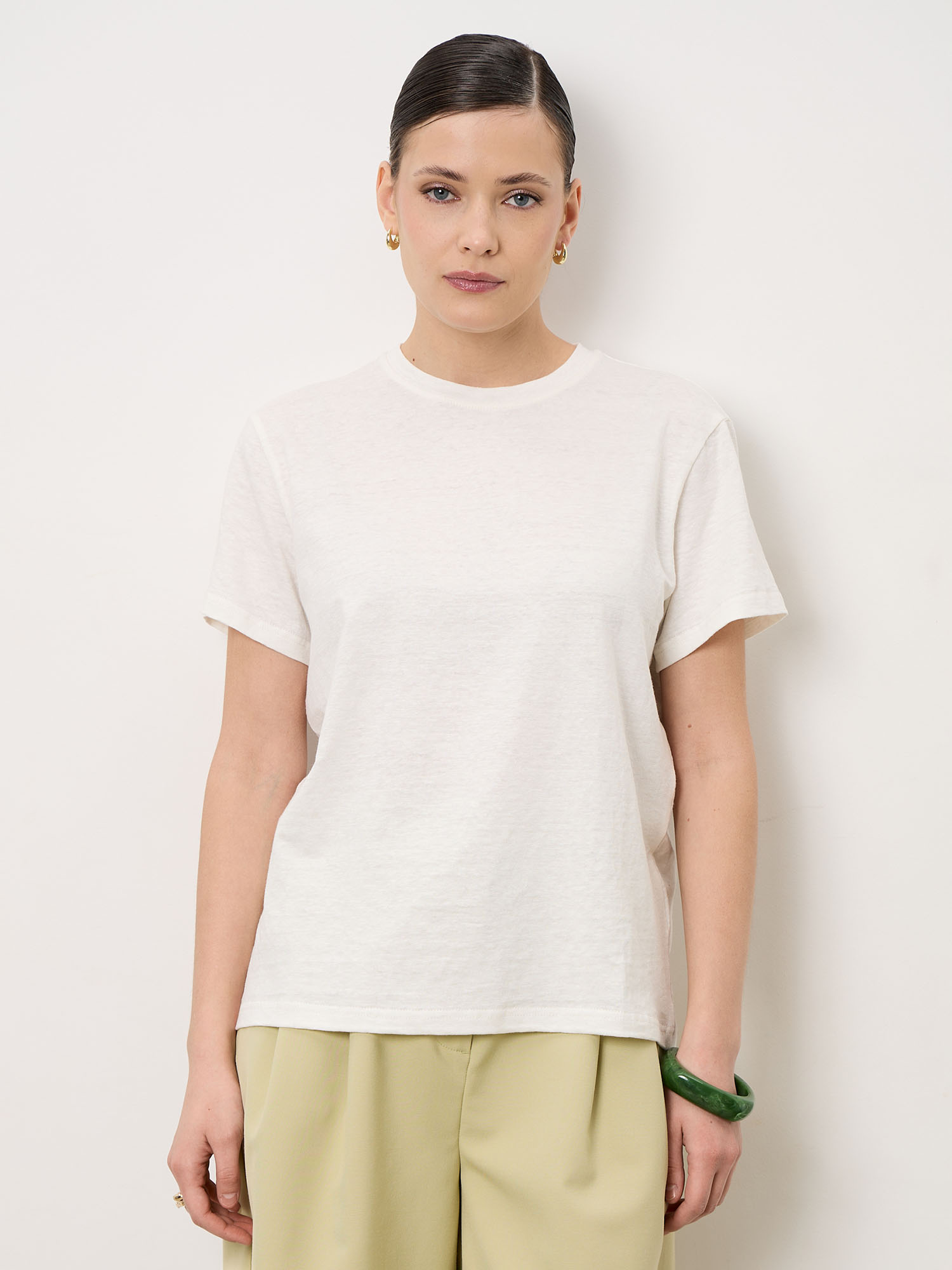 Женская футболка из льна — лёгкая базовая модель, идеально подходящая для повседневного гардероба. Обеспечивает комфорт и создаёт аккуратный минималистичный образ.