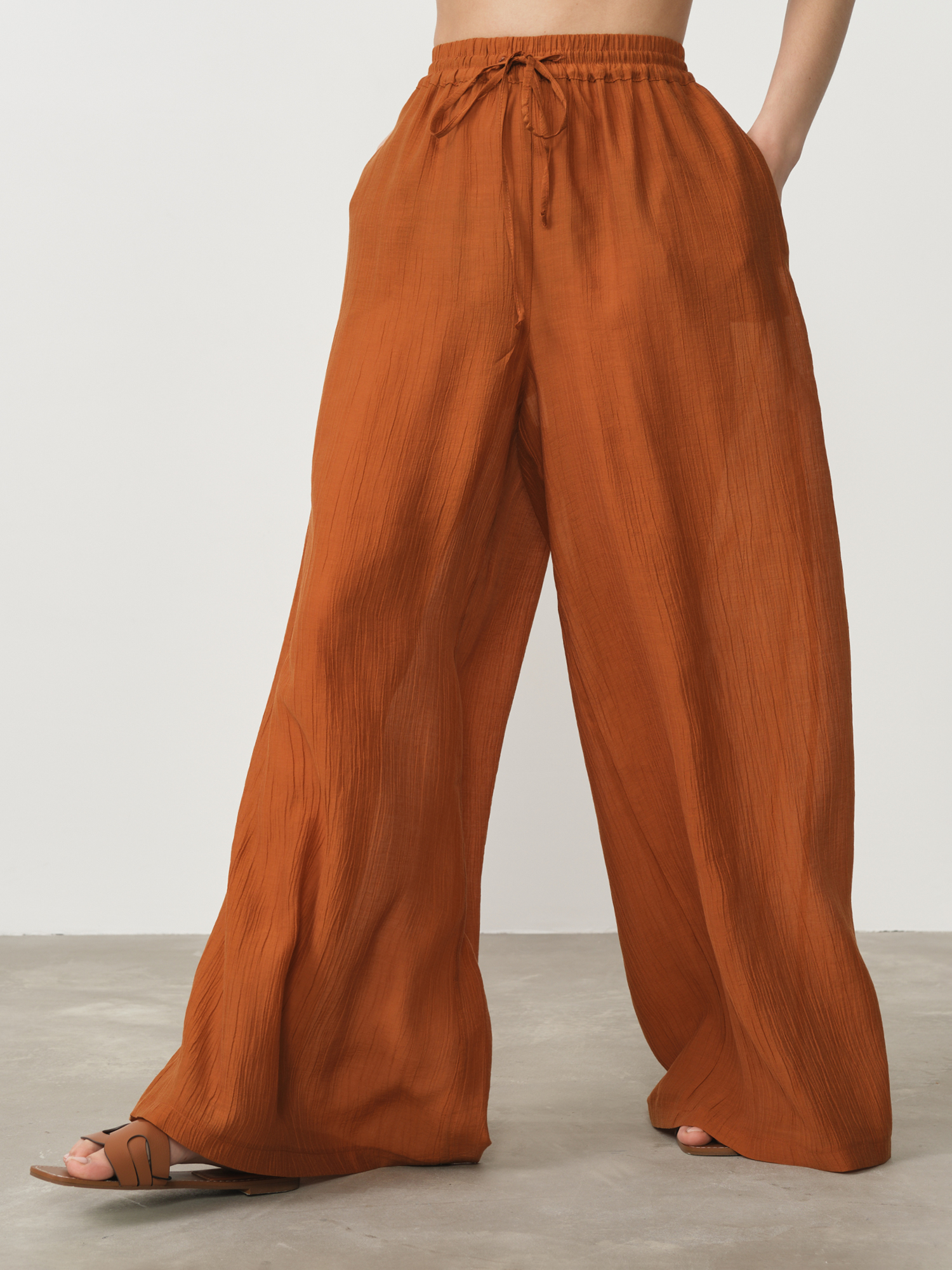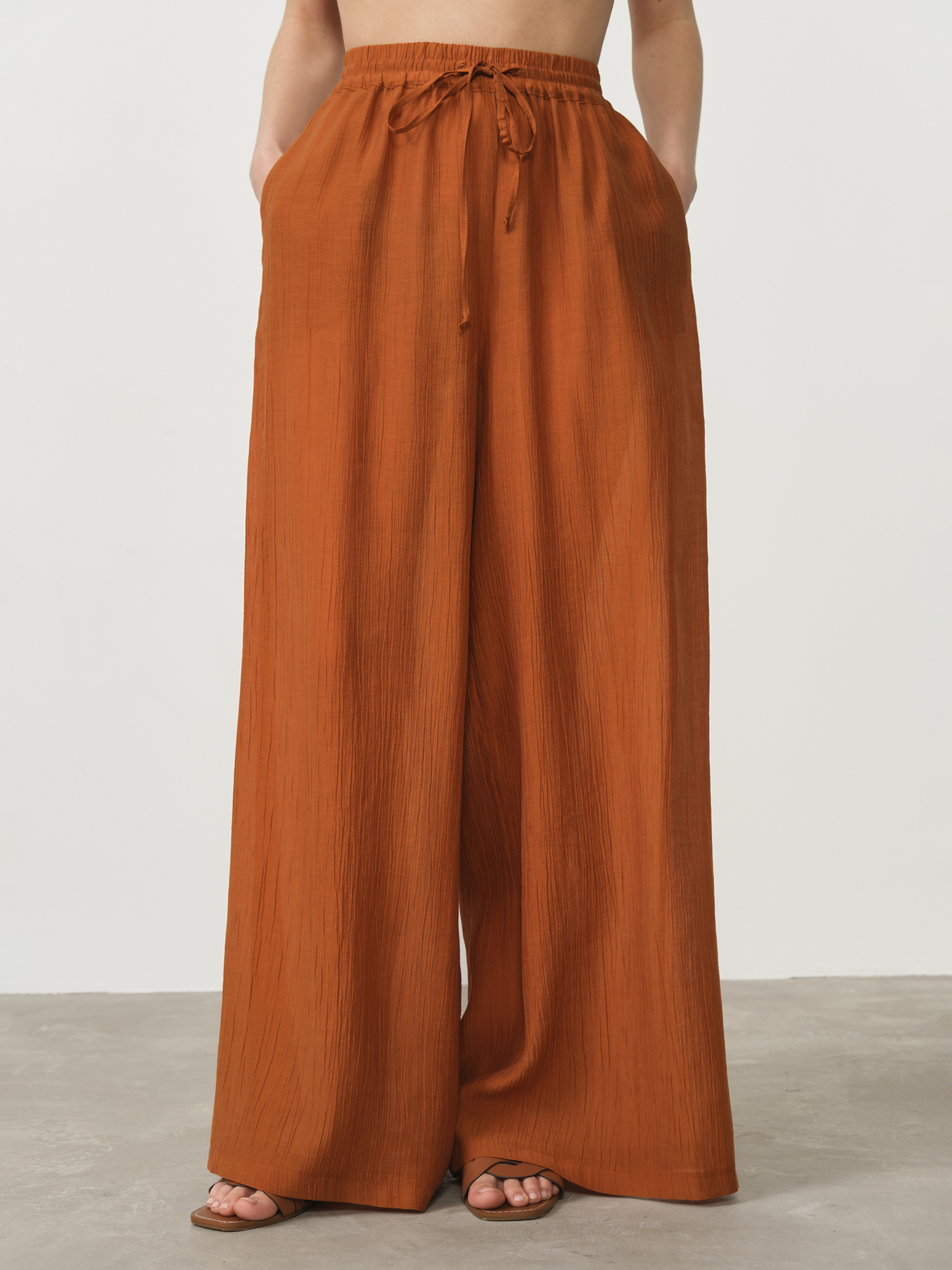 Экологичность лиоцелла делает эту модель ответственным выбором — производство требует меньше воды и энергии по сравнению с хлопком. Ткань устойчива к сминанию и сохраняет насыщенный цвет после множества стирок. Выберите эти брюки — пусть их теплый терракотовый оттенок и непревзойденный комфорт вдохновят вас на создание стильных образов с заботой о природе.