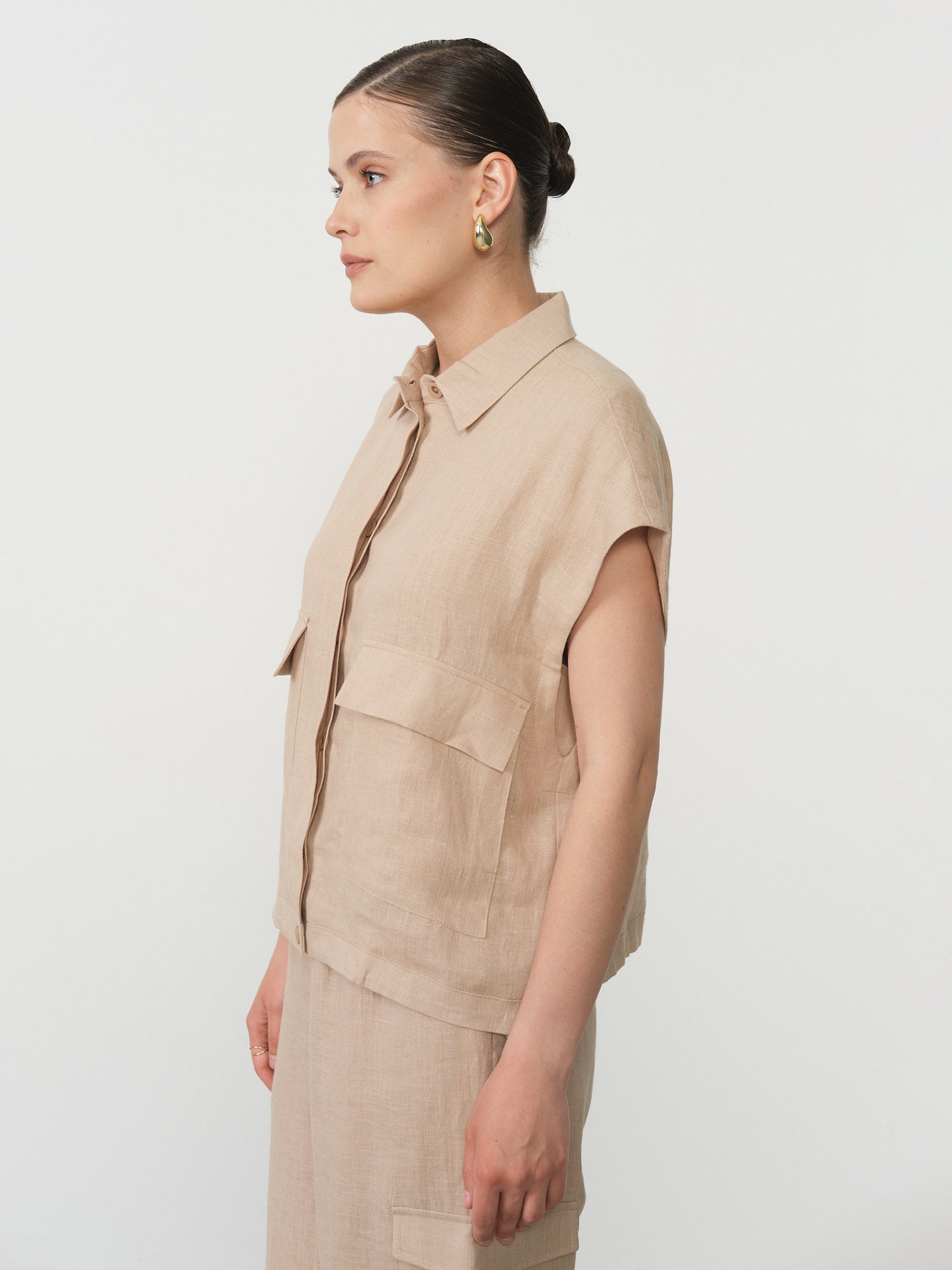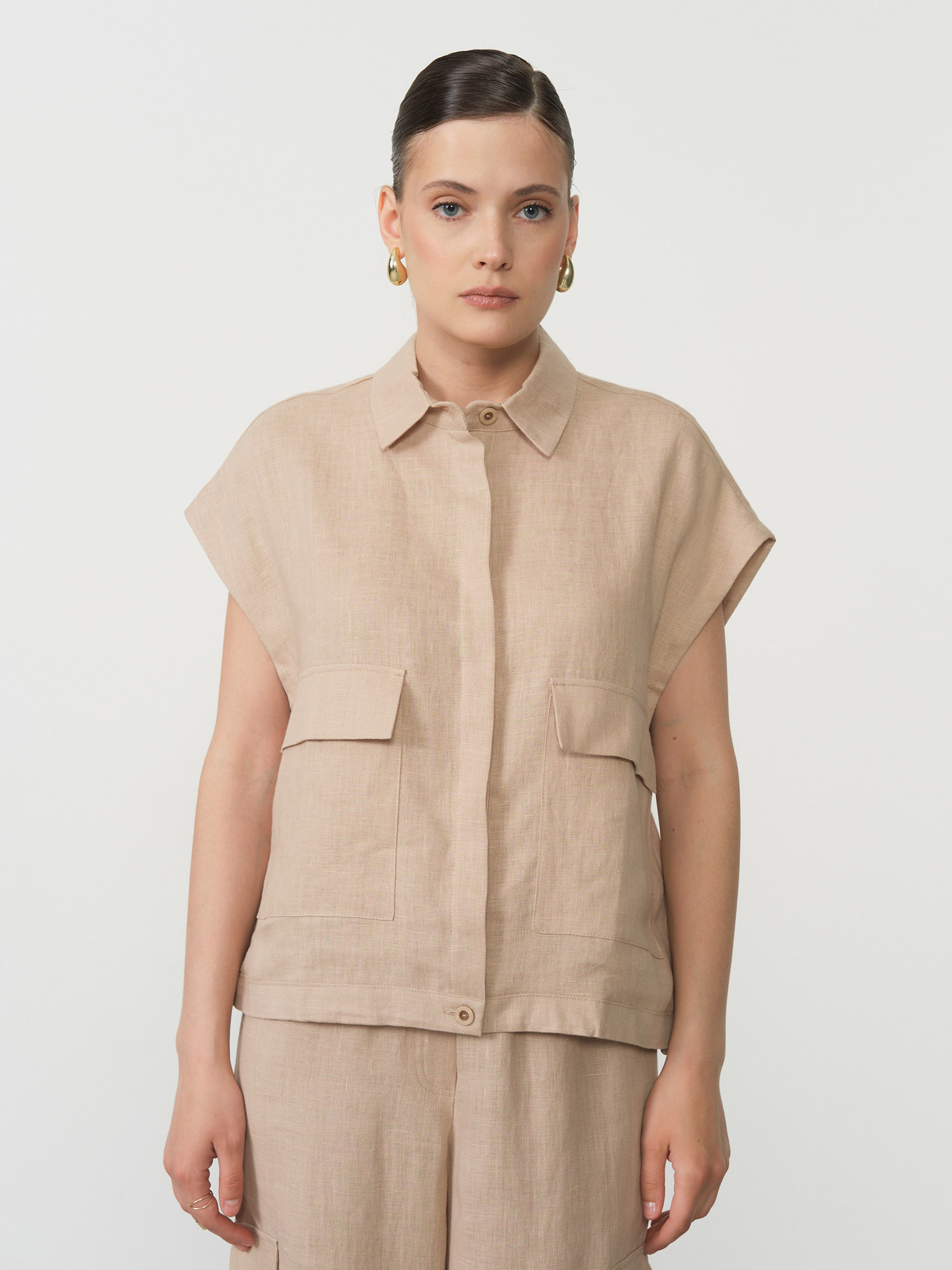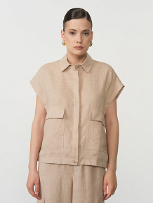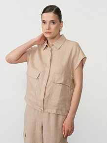 Накладные карманы, застёжка на пуговицы, короткий рукав, декоративные боковые элементы для регулировки посадки, аккуратная обработка швов.