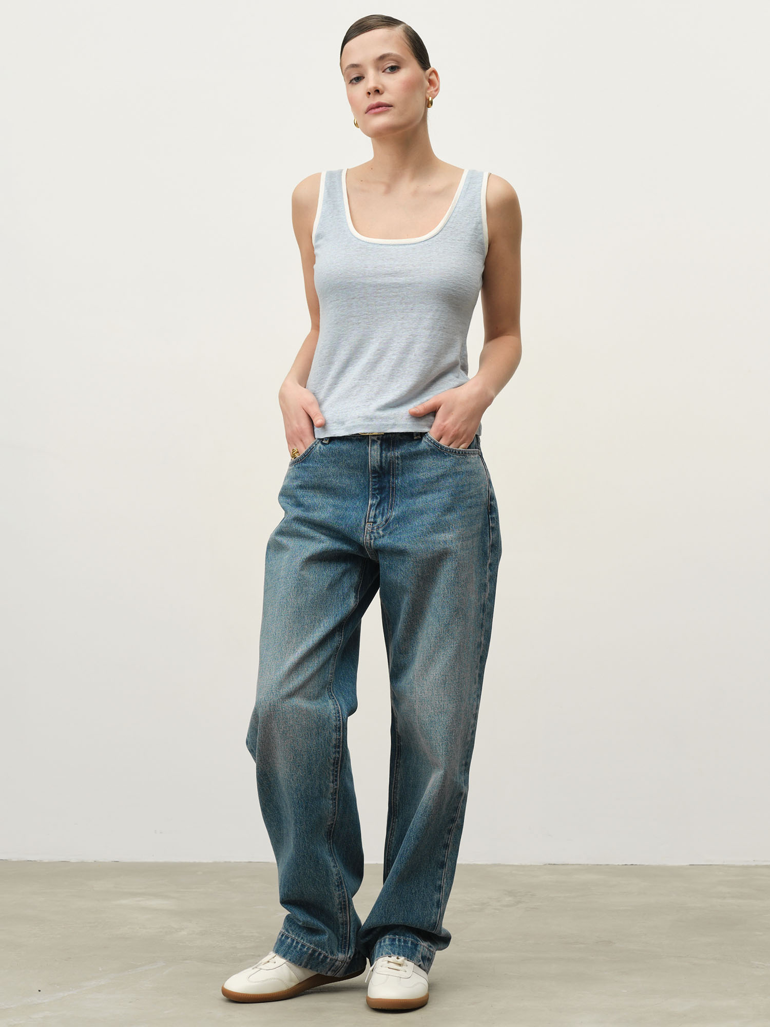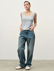Прямой силуэт с округлым вырезом и широкими бретелями. Лаконичный крой делает модель базовой и удобной для повседневной носки.