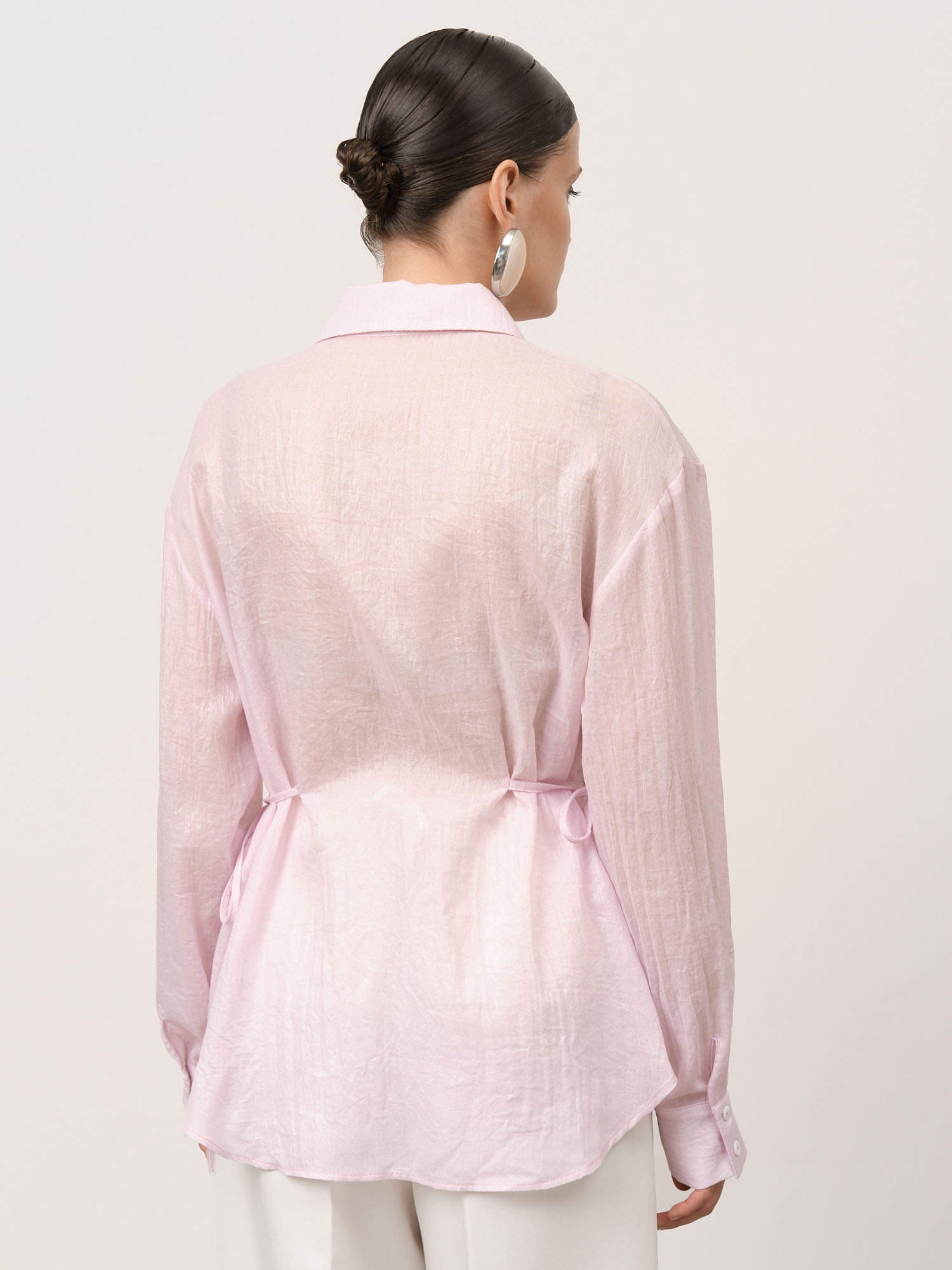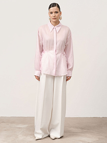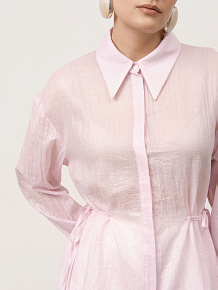 Застёжка на пуговицы, завязки по бокам для регулировки посадки, длинные рукава с манжетами, аккуратные швы, легкая фактура ткани.