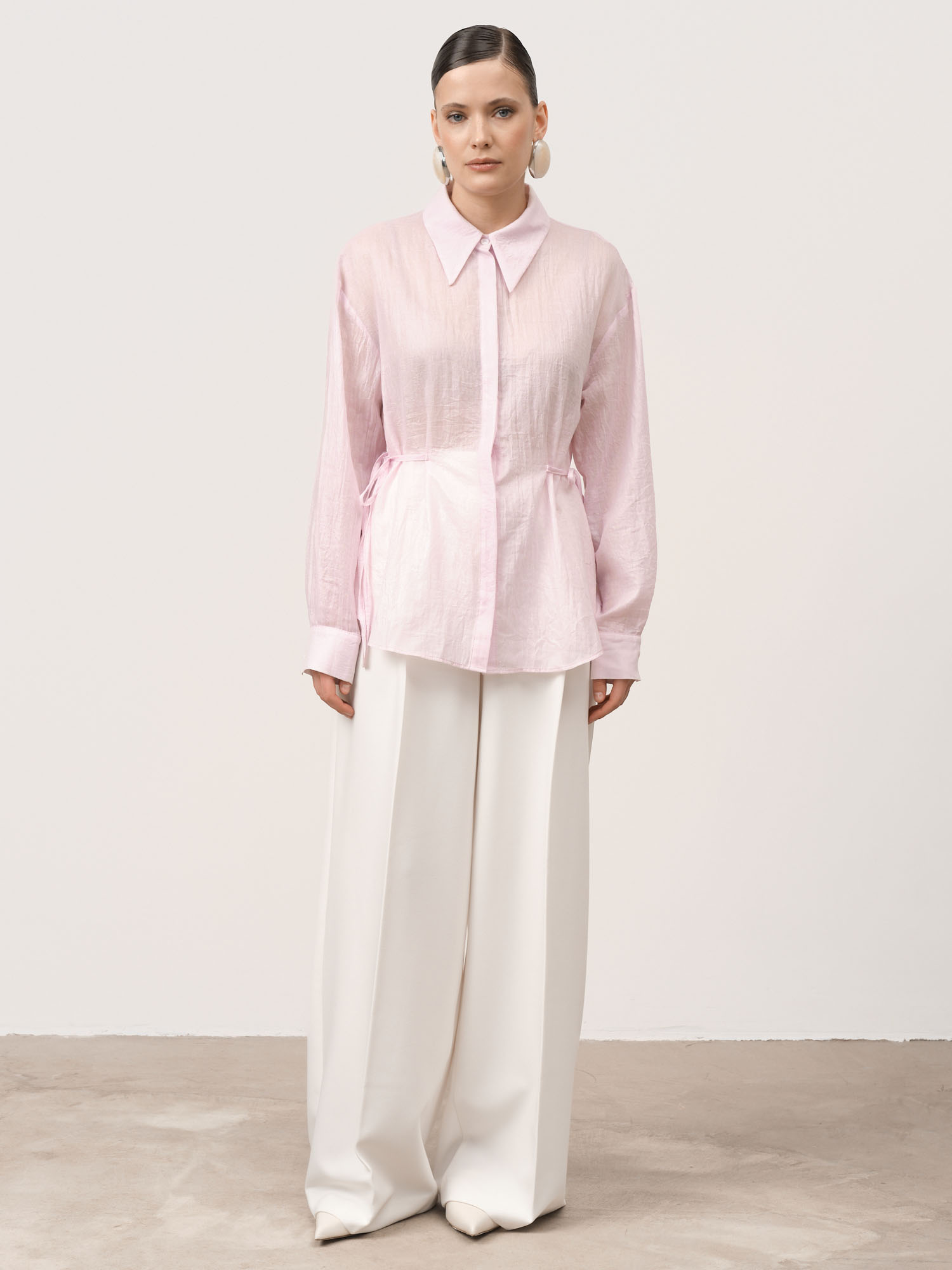 Свободный силуэт с акцентом на талии и классическим воротником. Лаконичный крой дополнен мягкими линиями, создающими женственный образ.