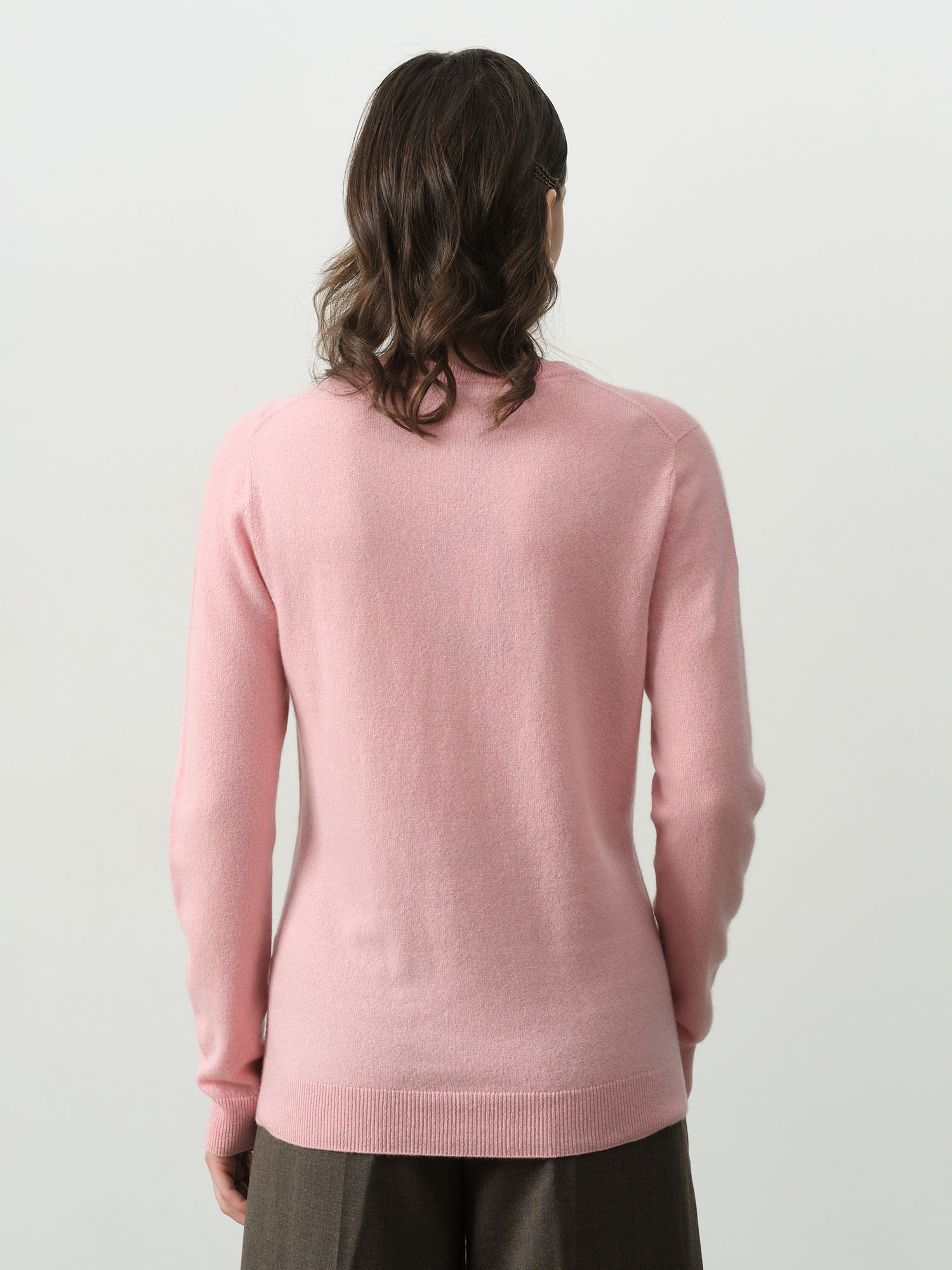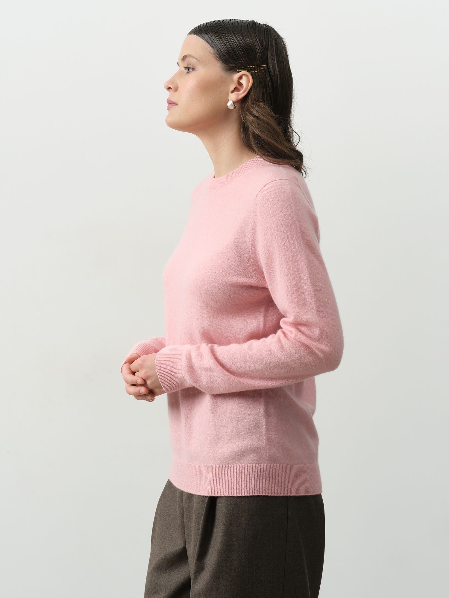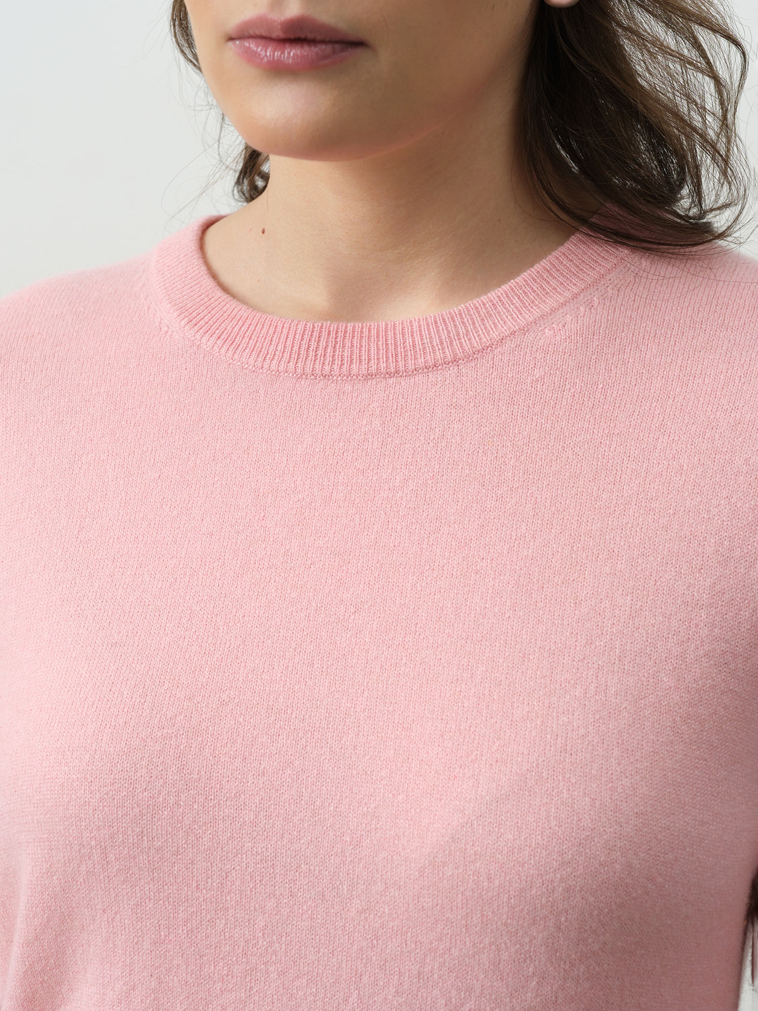 Модель выполнена с классической круглой горловиной и гладкой вязкой, которая подчеркивает благородную текстуру кашемира. Минималистичный крой делает изделие универсальным и подходящим для различных образов.