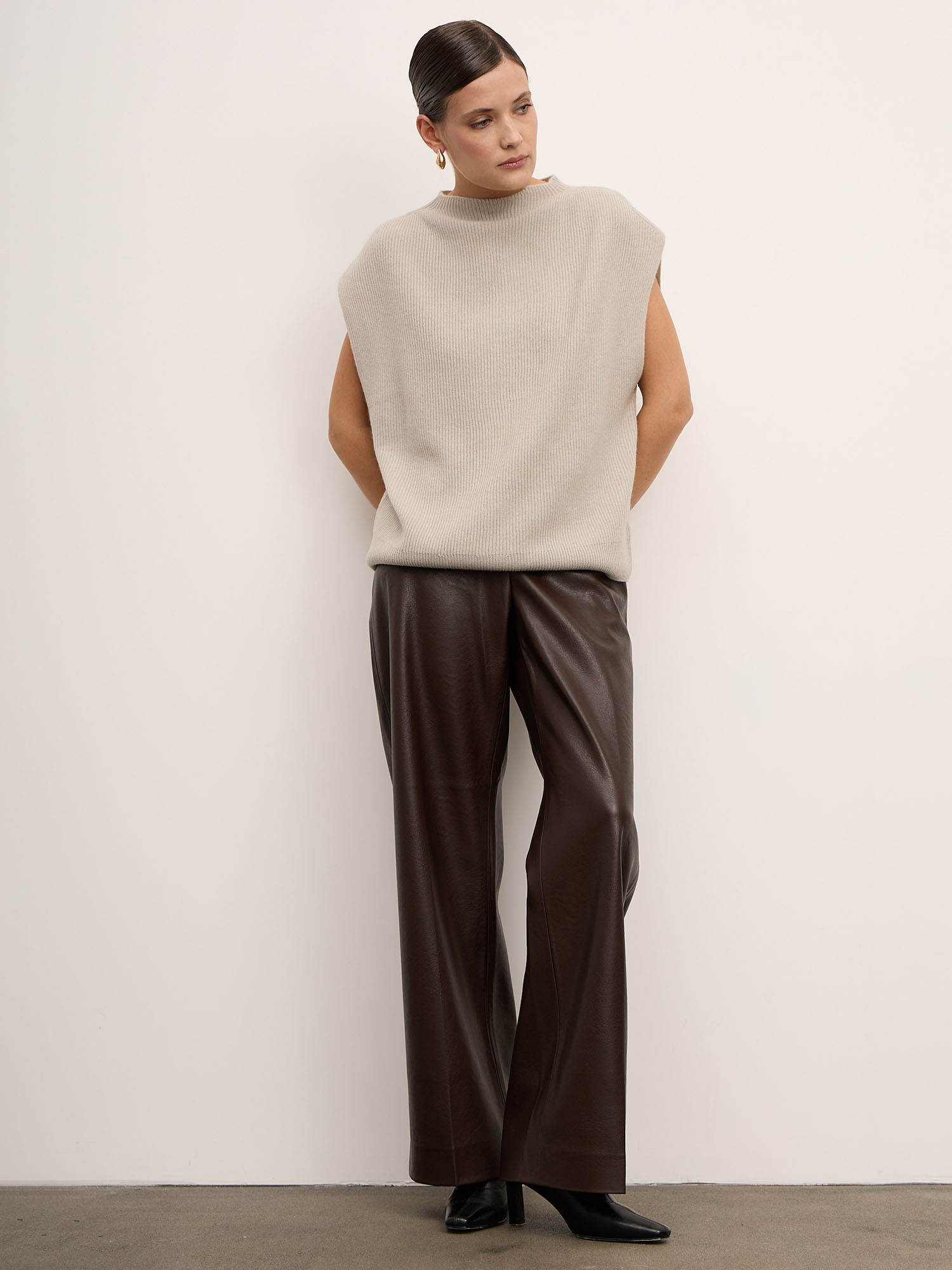 Модель выполнена без рукавов с аккуратным воротником-стойкой и гладкой вязкой. Минималистичный крой подчёркивает благородную текстуру материала и создаёт современный силуэт. Низ изделия оформлен эластичной вязкой, что помогает сохранять форму.