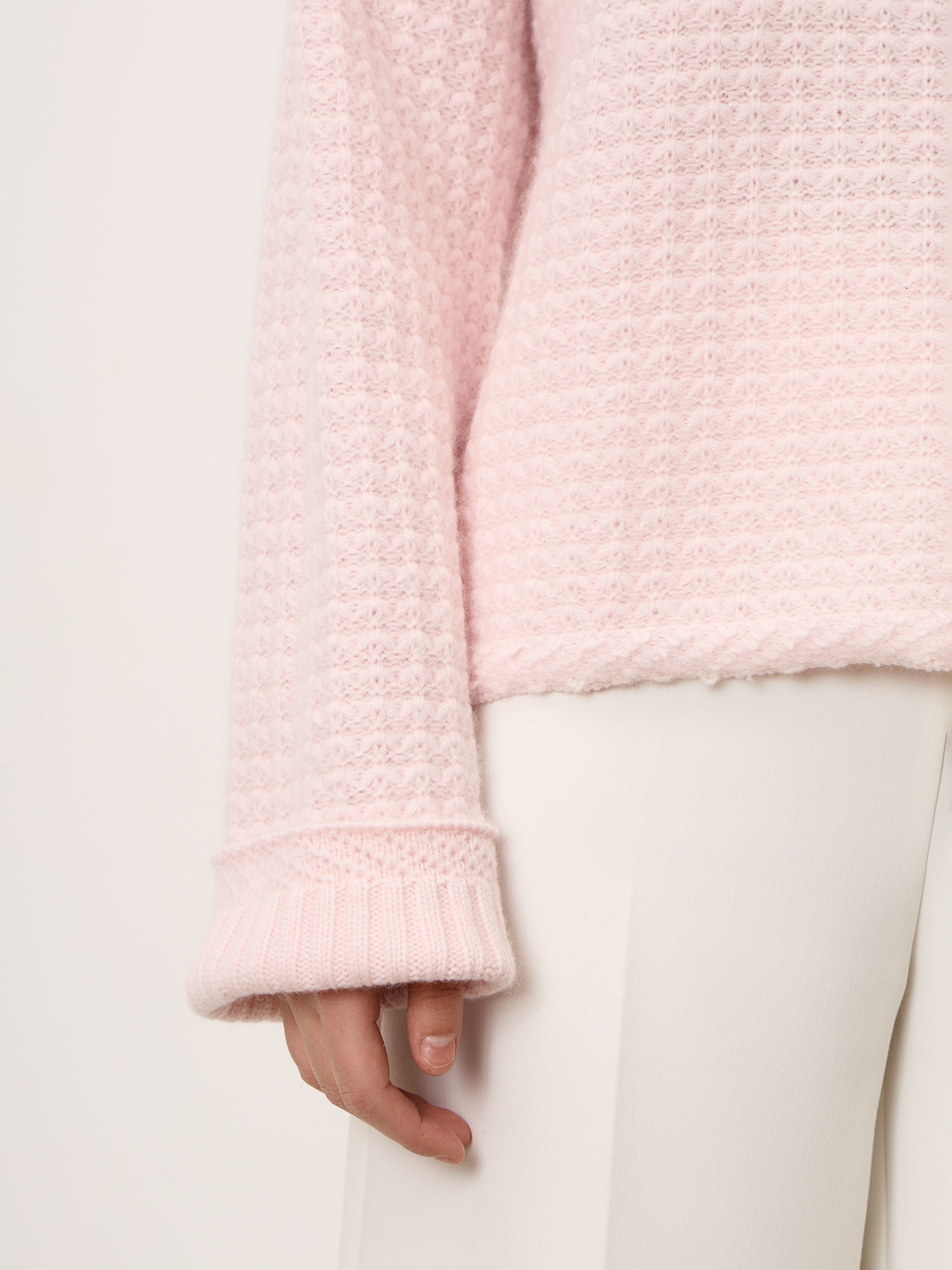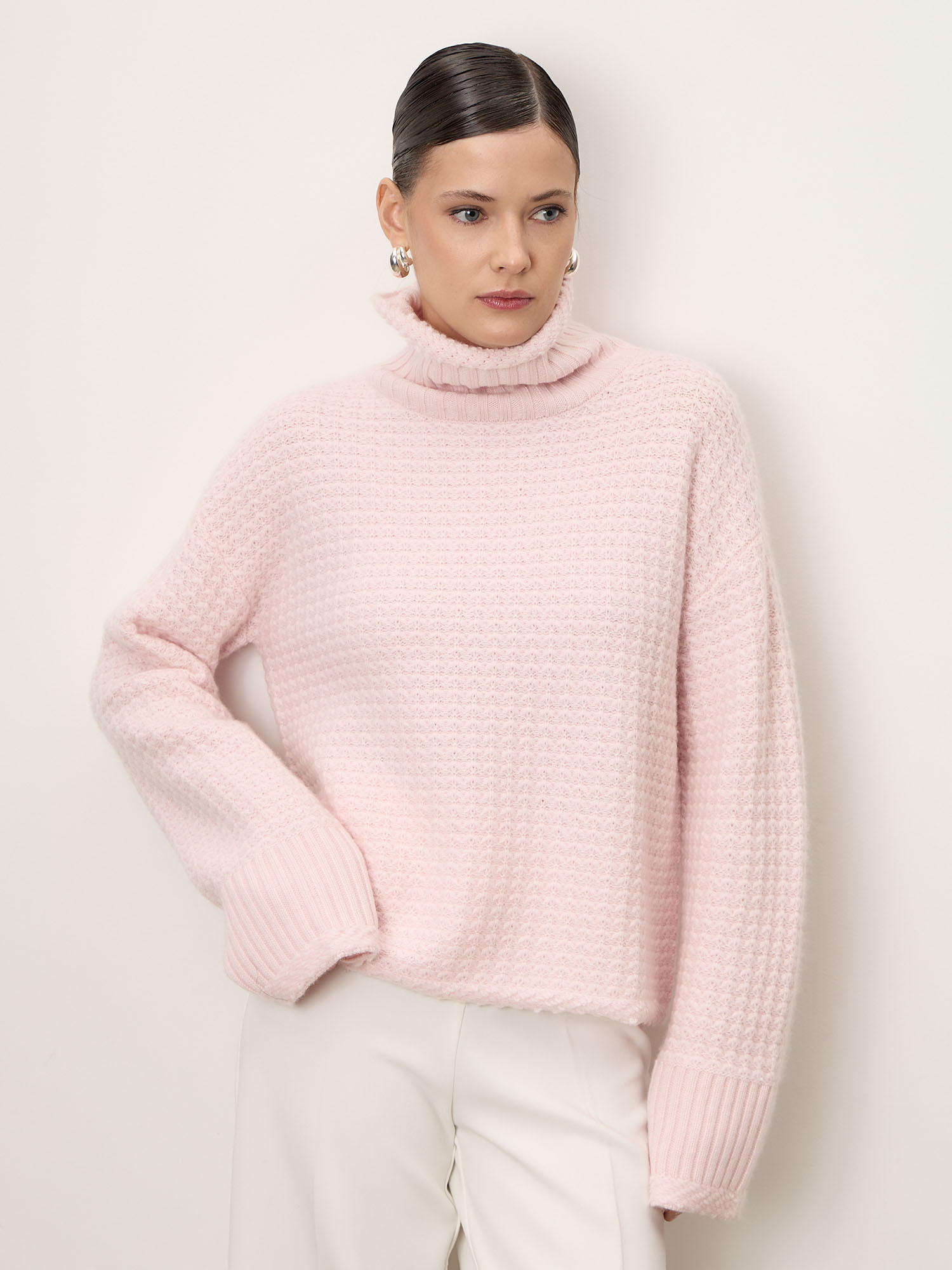 Модель выполнена с высоким воротником и фактурной рельефной вязкой, которая придаёт изделию выразительность. Объёмные рукава и свободный силуэт создают современный расслабленный стиль. Эластичные манжеты и низ изделия аккуратно оформлены и помогают сохранять форму.
