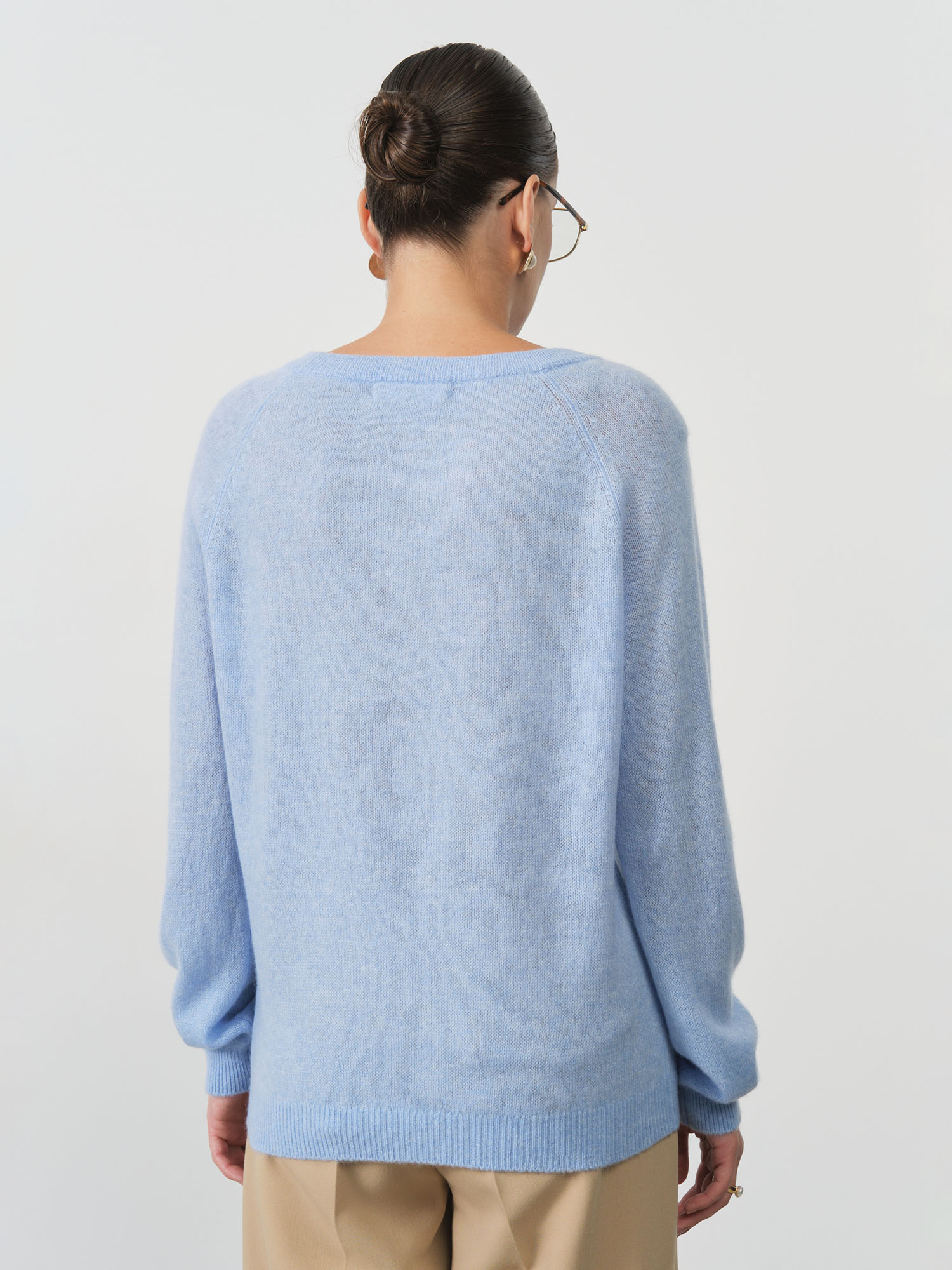 Джемпер очень тонкий и лёгкий, цвет очень приятный - нежно голубой, но модель сильно большемерит.