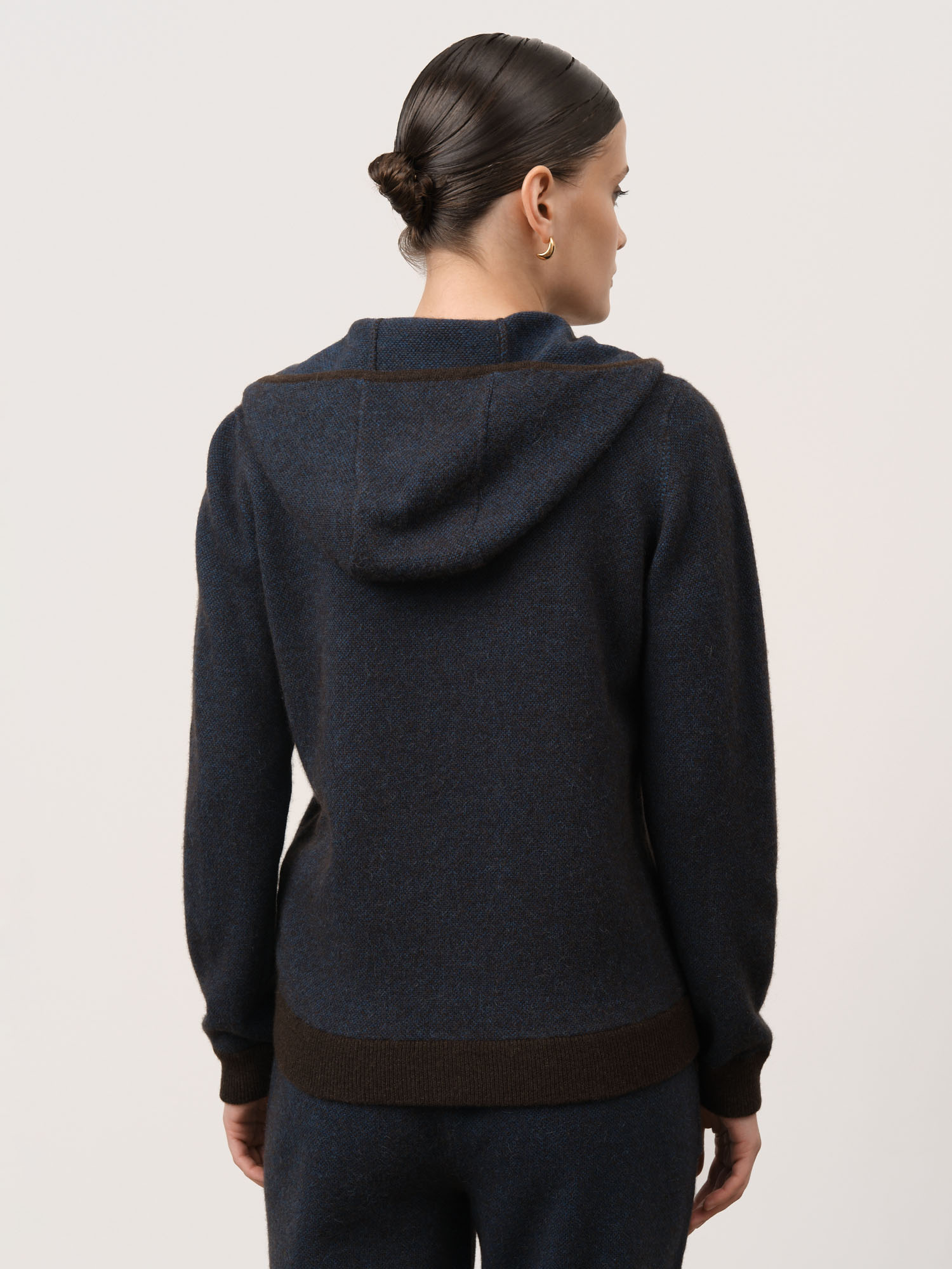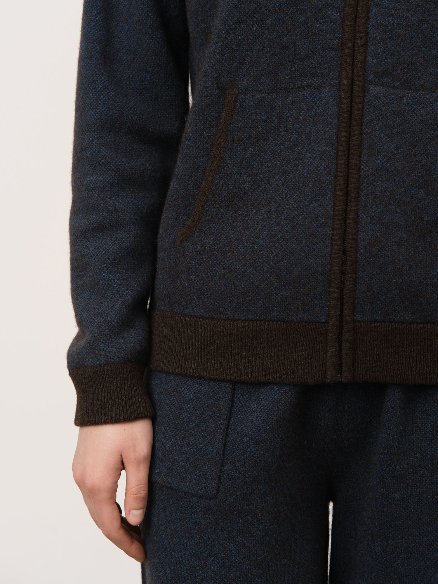 Капюшон, центральная застёжка на молнии, удобные боковые карманы и контрастная отделка манжет и нижнего края. Плотная вязка помогает изделию сохранять форму и аккуратный внешний вид.