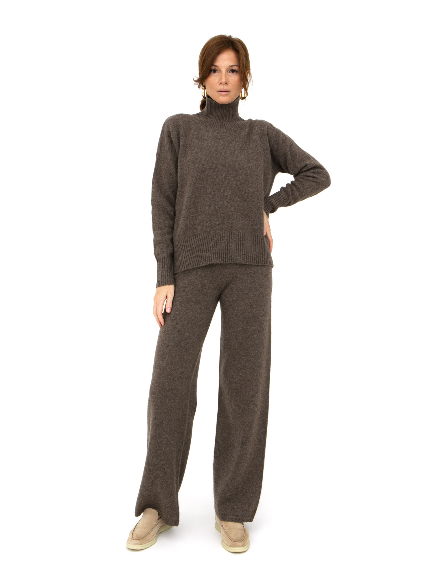 Модель выполнена в минималистичном стиле с высоким воротником и гладкой вязкой. Прямой силуэт и лаконичные линии подчёркивают благородную текстуру натурального материала.