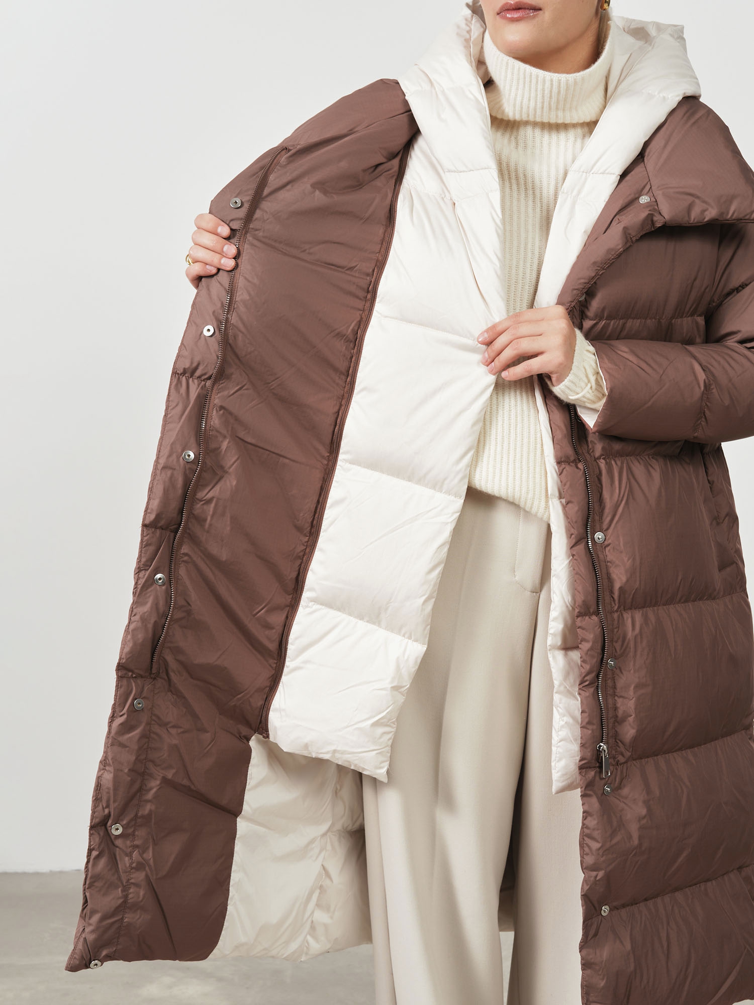 Женское удлинённое пуховое пальто в универсальном коричневом оттенке. Модель сочетает лаконичный дизайн и высокий уровень комфорта, идеально подходит для холодного сезона и повседневных образов.